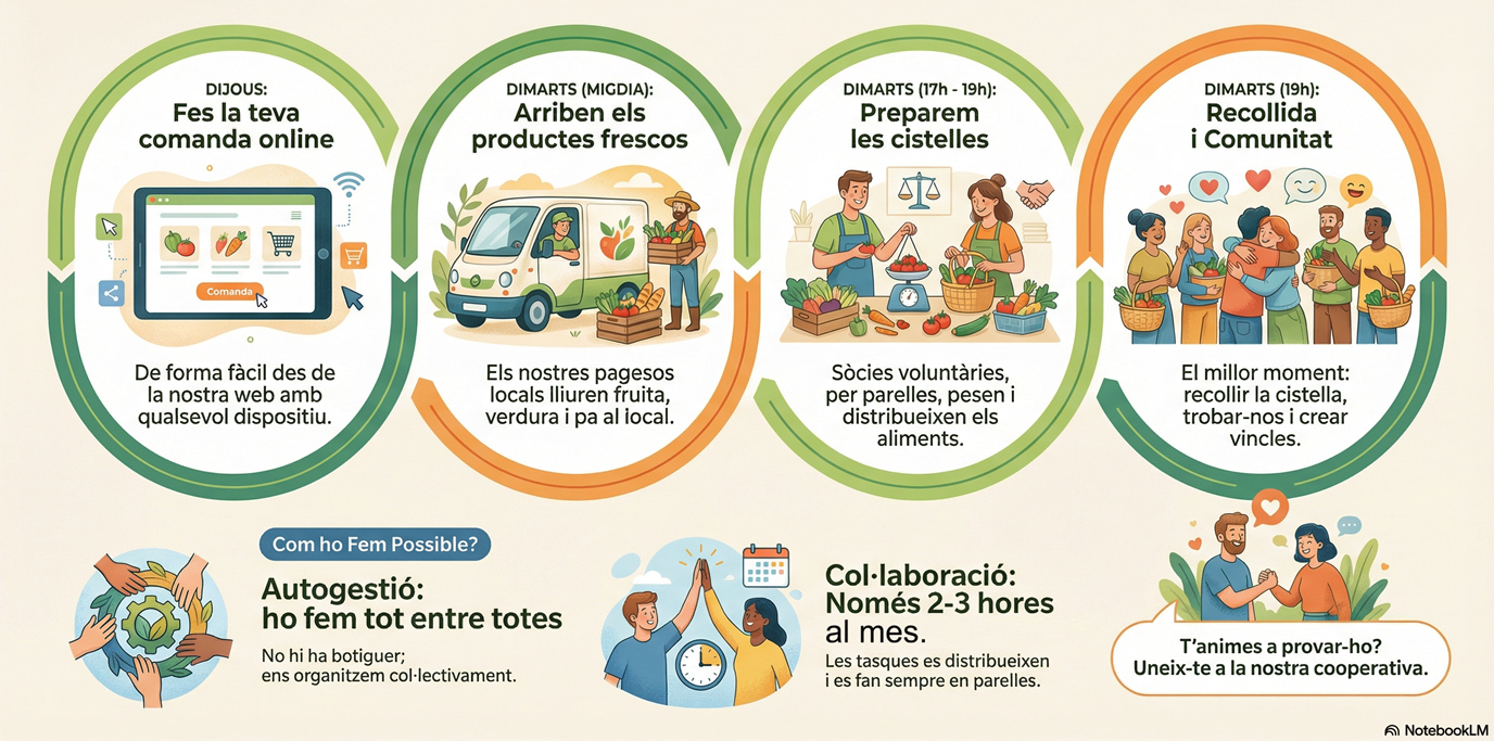 Som una cooperativa de consum de productes eco-biològics, que vol ser autogestionada pels socis/es de forma igualitària, horitzontal i solidària. Som al nucli de Rubí.